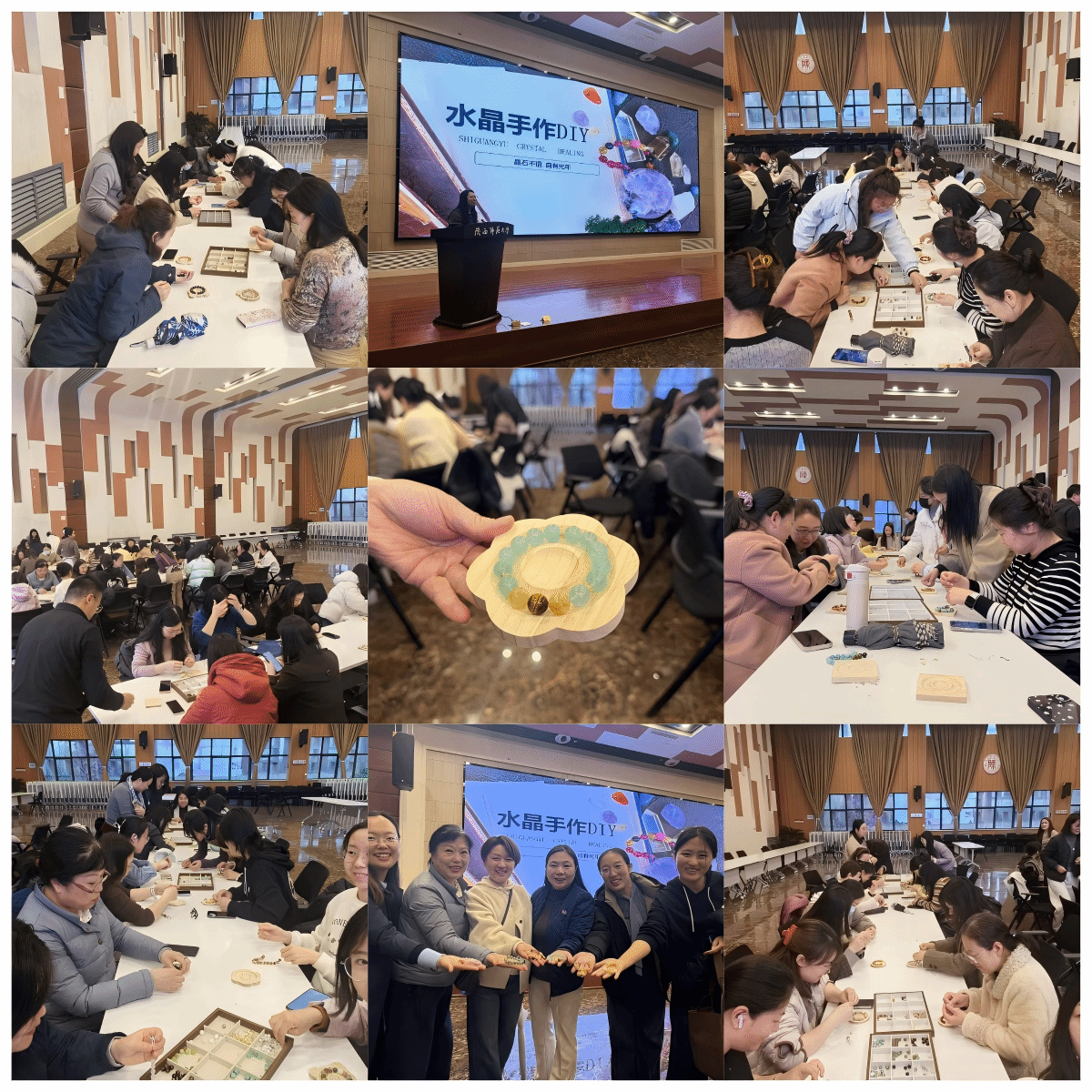近日,机关党委、机关工会在新勇学生活动中心多功能厅组织举办“自然、艺术与美”系列活动之“三八”国际劳动妇女节“一珠一牵,绾作腕间流光”水晶手串DIY手作活动,机关相关部门130余名女职工参与活动。活动现场气氛轻松、热烈,大家聆听了关于天然水晶形成过程、水晶的不同类型以及其在中西方文化历史中的丰富内涵的介绍,并将自身对自然、艺术和美的理解与感知融入水晶手串的设计与制作中,既放松、愉悦了心灵,也收获了有形与无形的美的体验。