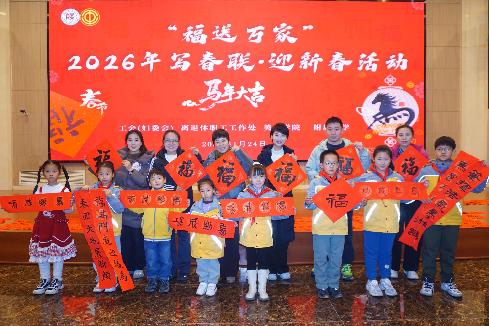 骏马迎春送福至,翰墨飘香暖人心。1月24日下午,由工会(妇委会)、离退休职工工作处、美术学院、附属小学联合举办的“福送万家”2026年写春联·迎新春活动在长安校区新勇活动中心多功能厅举行。校内书法名家与书法爱好者齐聚一堂,挥毫泼墨,以笔墨传递温情,共同为全校师生书写新春祝福。